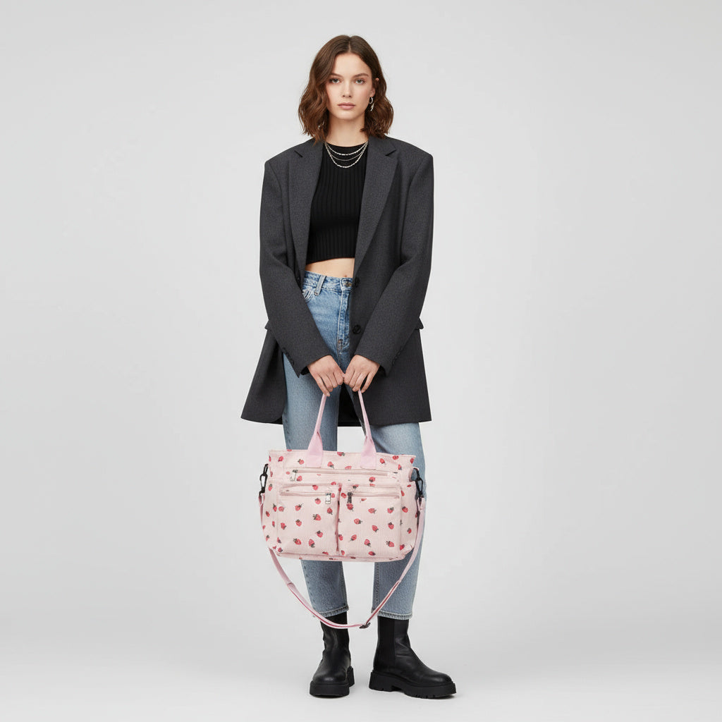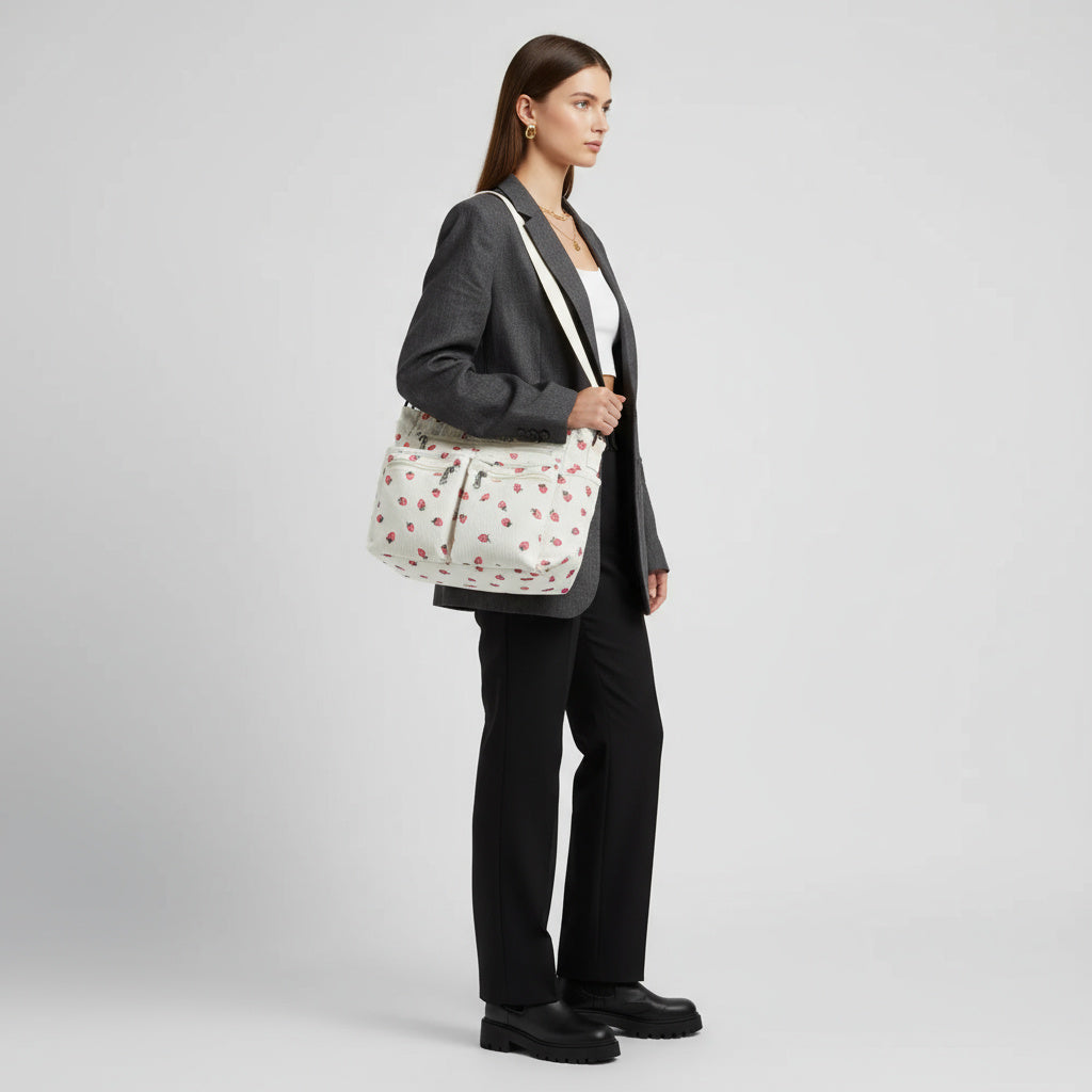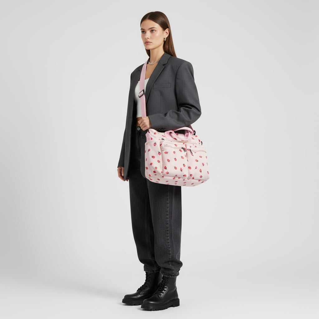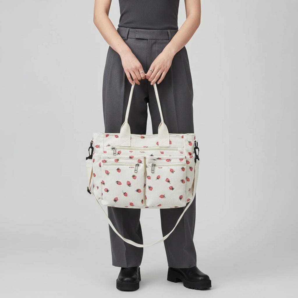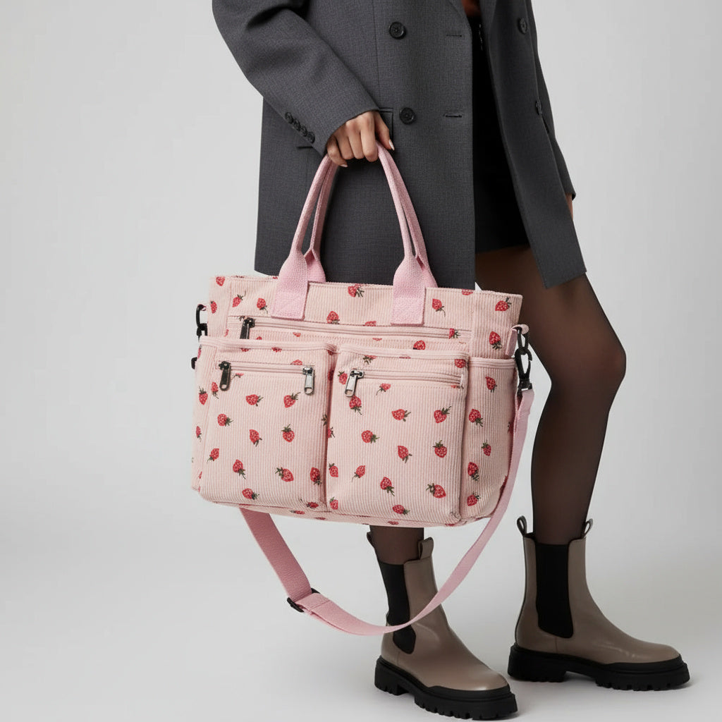 Die "Berry"-Tasche aus Cordstoff mit Erdbeermuster bietet eine weiche, leichte Textur und viel Stauraum. Das geräumige Innenfach ist mit weichem Polyester gefüttert und bietet Platz für all Ihre Essentials. Mit einem verstellbaren Schulterriemen, einem großen Hauptfach mit Reißverschluss und drei zusätzlichen Reißverschlusstaschen auf der Vorderseite ist diese Tasche sowohl stilvoll als auch praktisch.