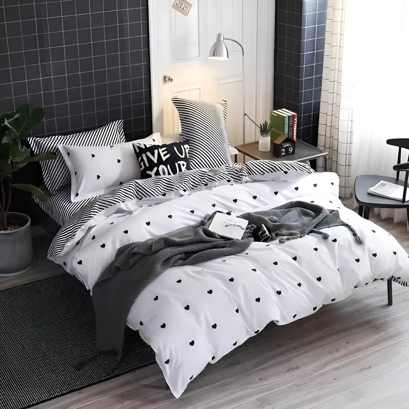 Unser CozyHearts Bettbezug mit elegantem schwarzem Liebesprint verwandelt Ihr Schlafzimmer in eine stilvolle Wohlfühloase. Dieses 3-teilige Set, bestehend aus einem Bettbezug und zwei Kissenbezügen, bietet ultimativen Komfort und ist ideal für Ihr Schlafzimmer oder Gästezimmer.