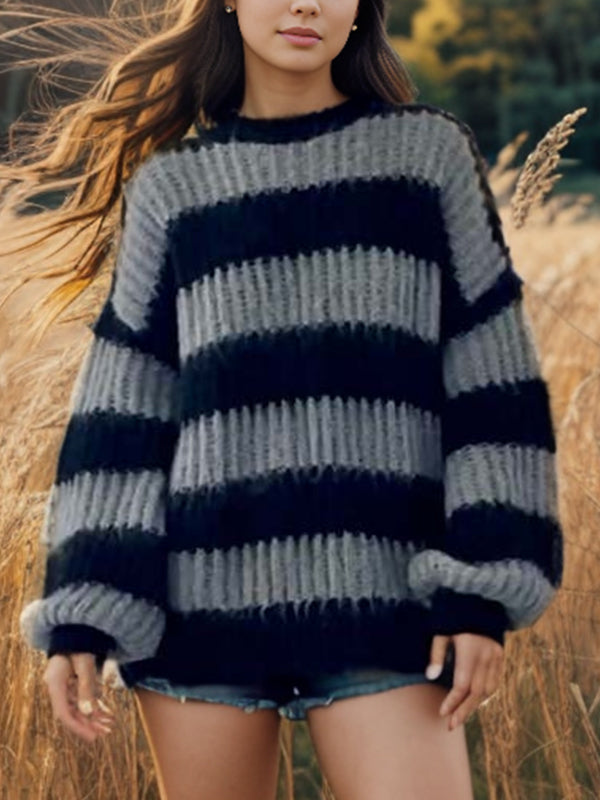 Gestreifter Rundhalspullover mit Laternenärmel