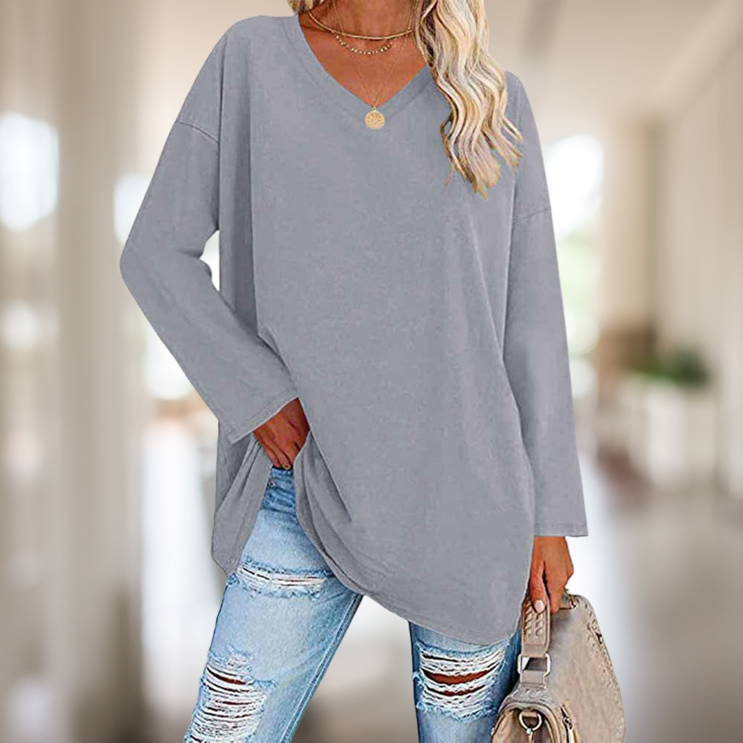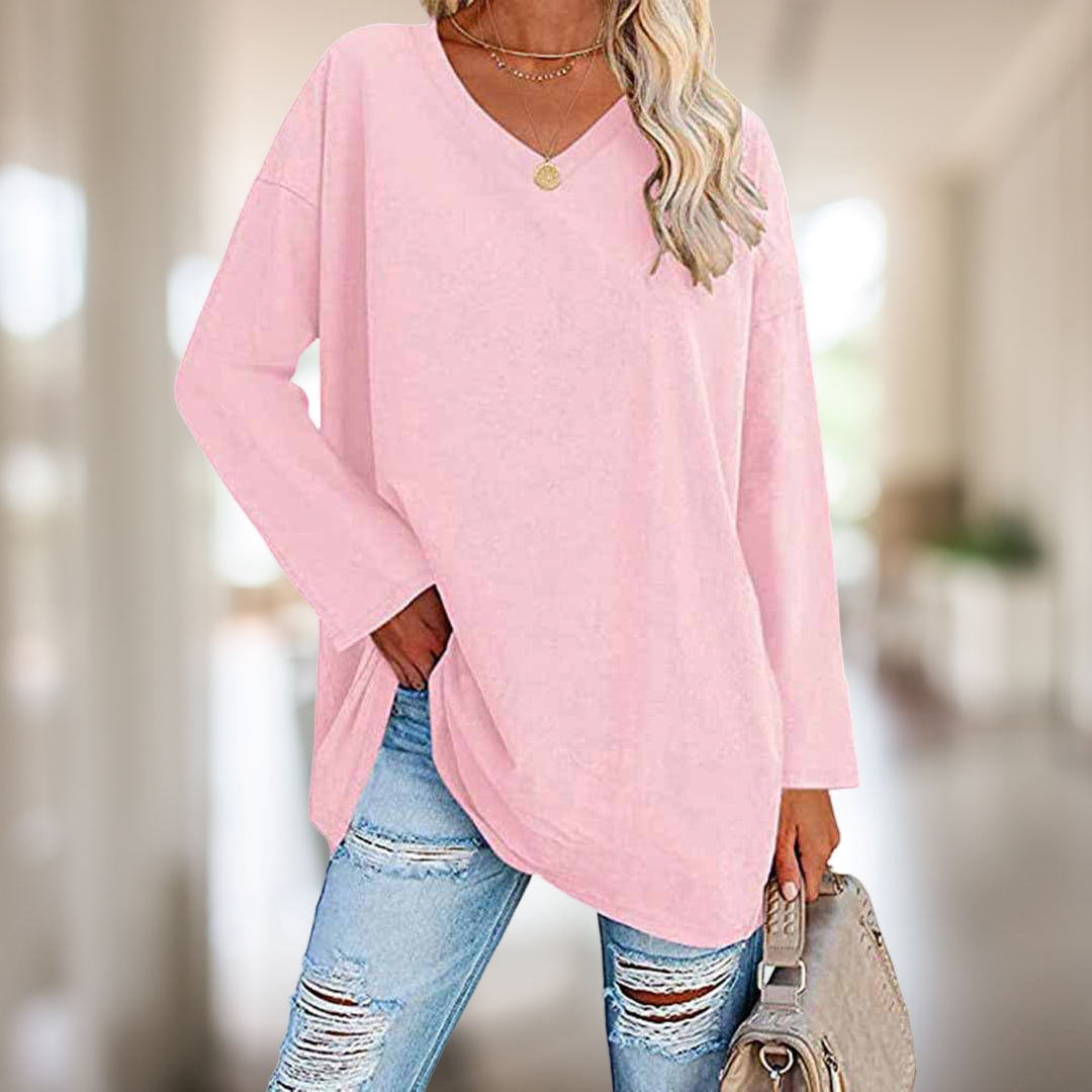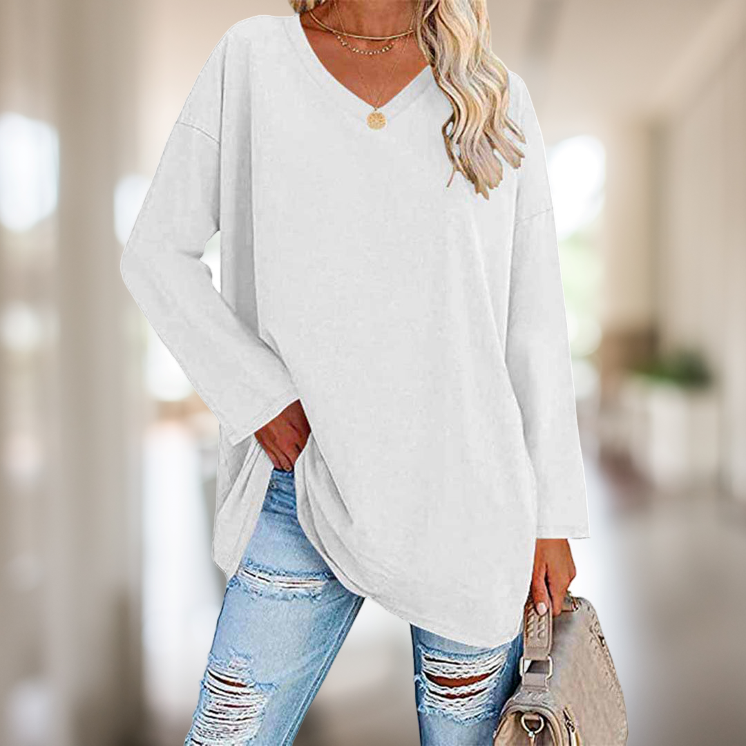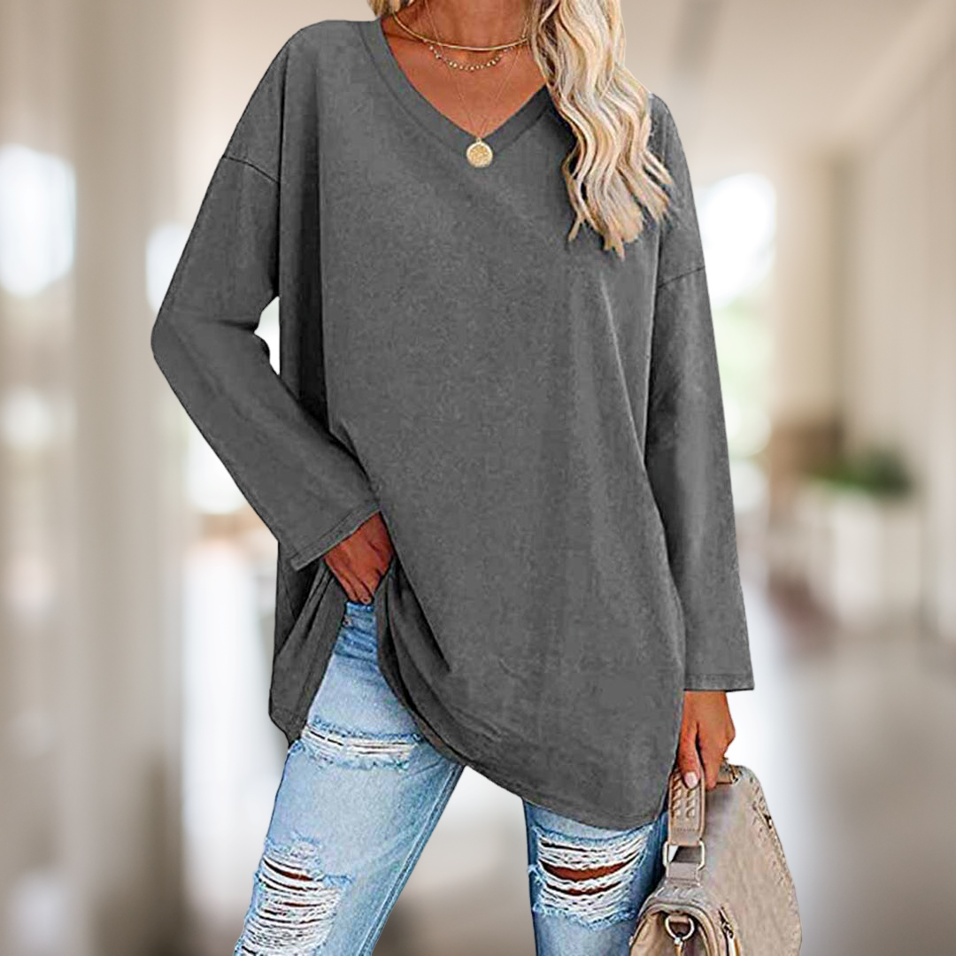 Das Shirt mit V-Ausschnitt hat eine schicke, fließende Silhouette und bietet eine schmeichelhafte Passform, die anmutig fällt.