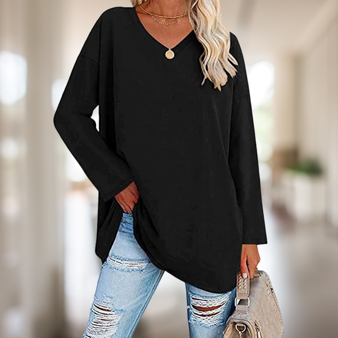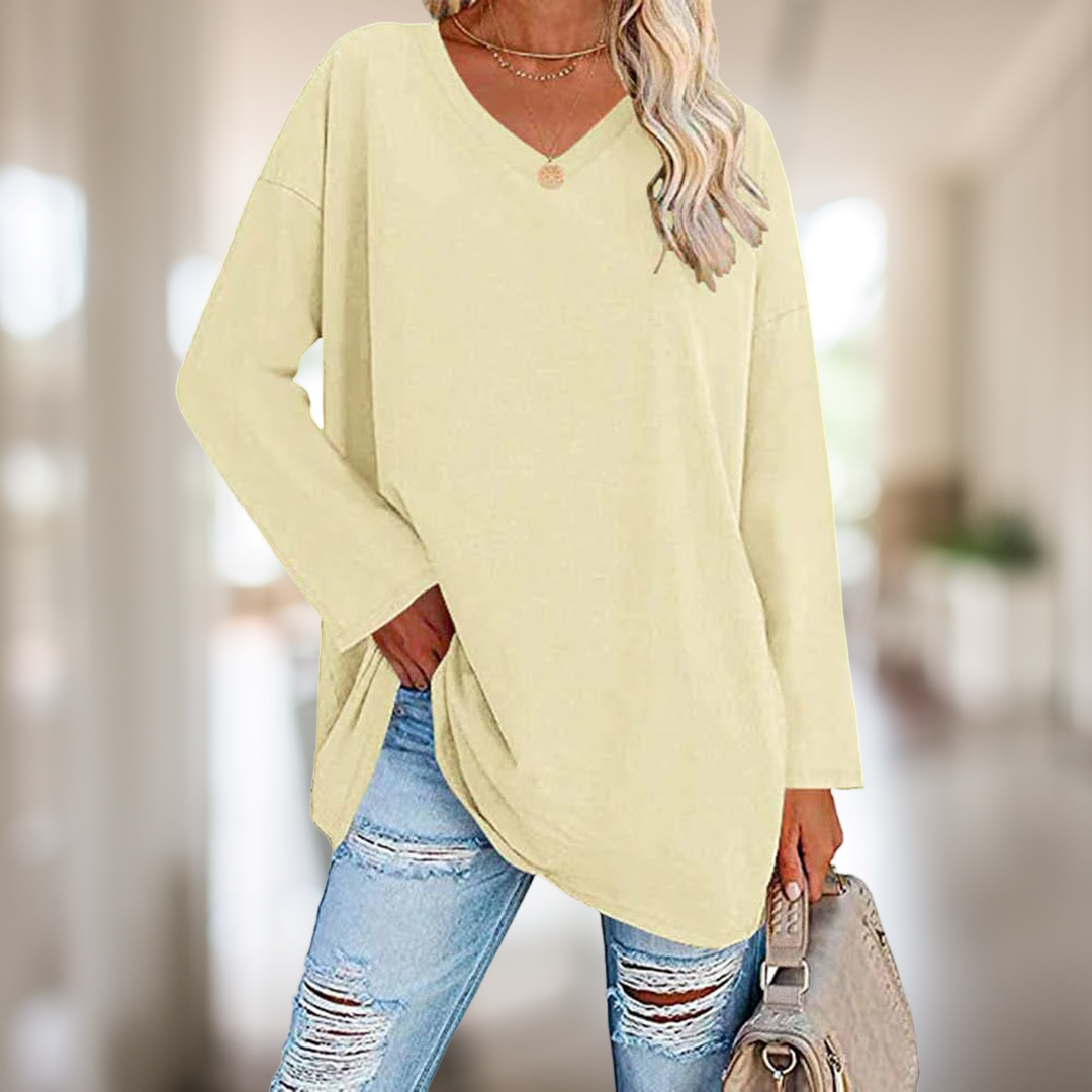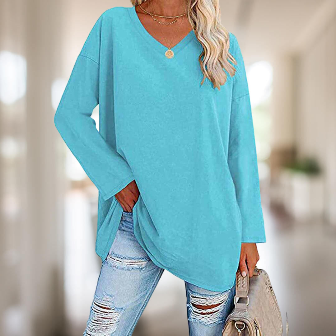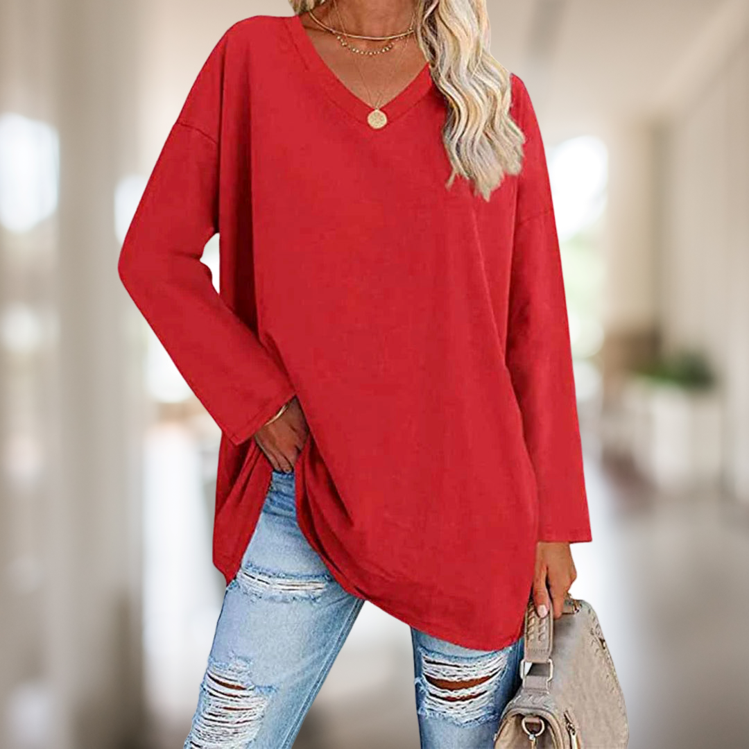 Das Shirt mit V-Ausschnitt hat eine schicke, fließende Silhouette und bietet eine schmeichelhafte Passform, die anmutig fällt.