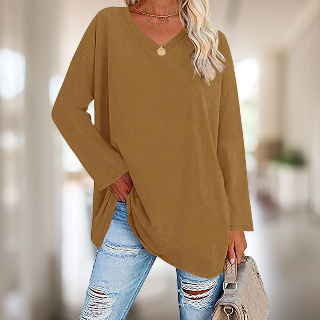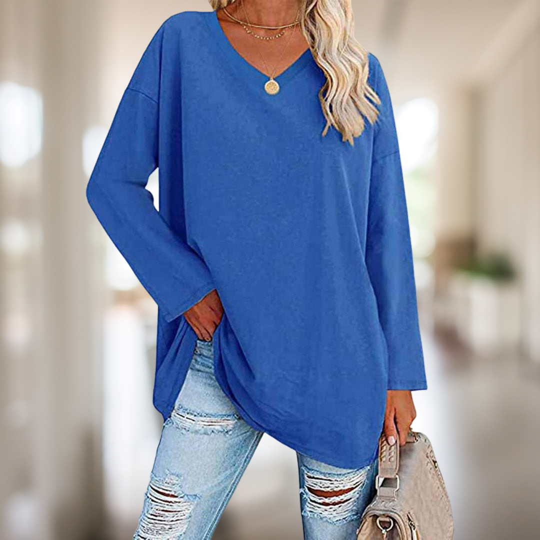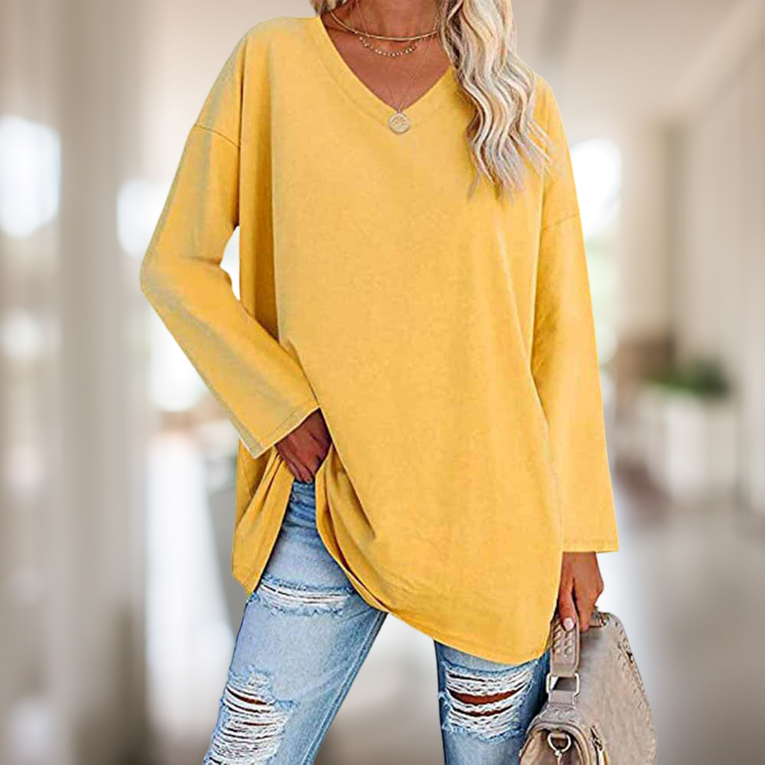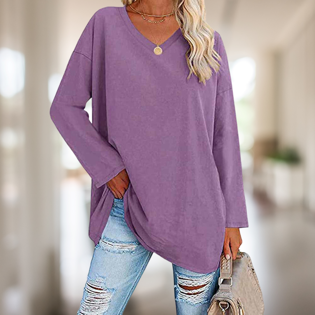 Das Shirt mit V-Ausschnitt hat eine schicke, fließende Silhouette und bietet eine schmeichelhafte Passform, die anmutig fällt.