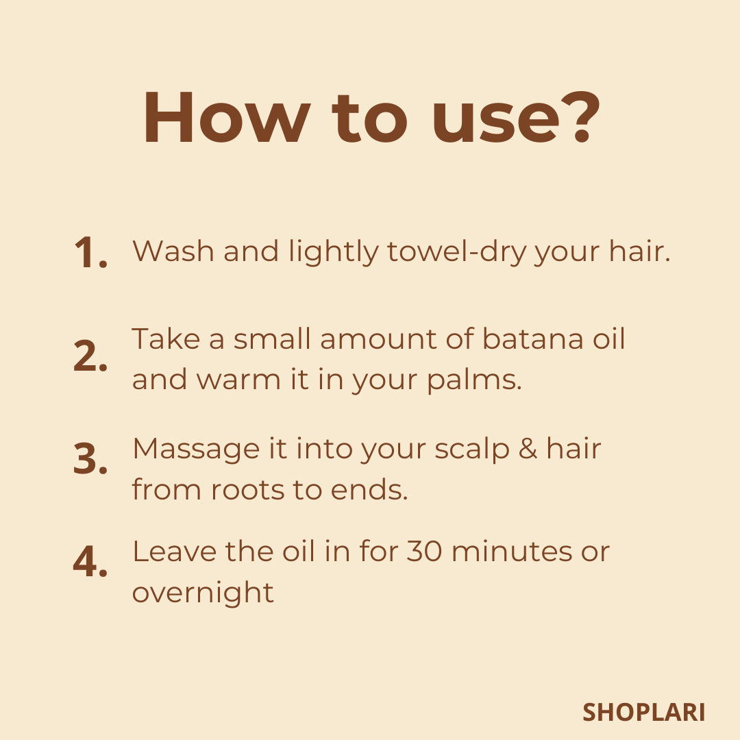 Unser Bio-Batanaöl ist reich an Vitamin A & E sowie essenziellen Fettsäuren, die helfen, Haarschäden durch Stress, aggressive Chemikalien und stark raffinierte Shampoos & Conditioner rückgängig zu machen.