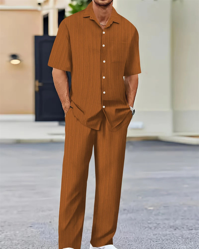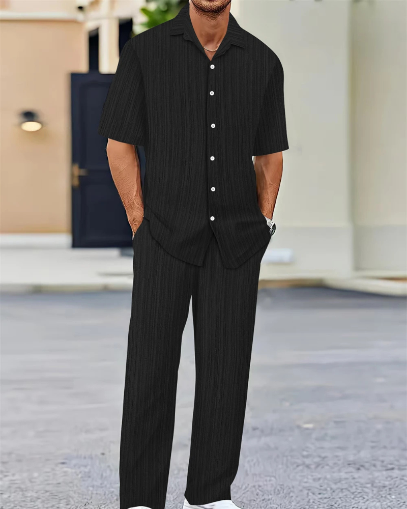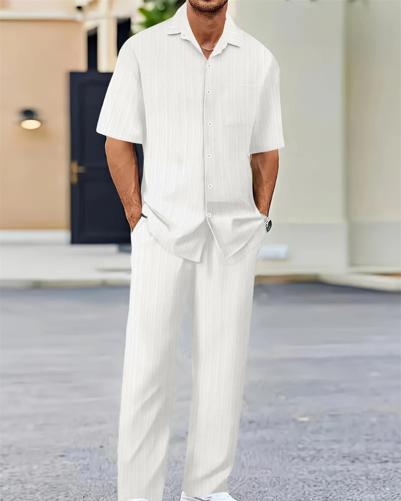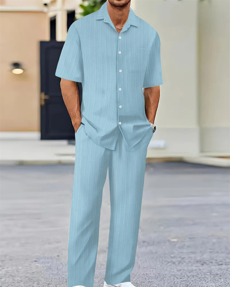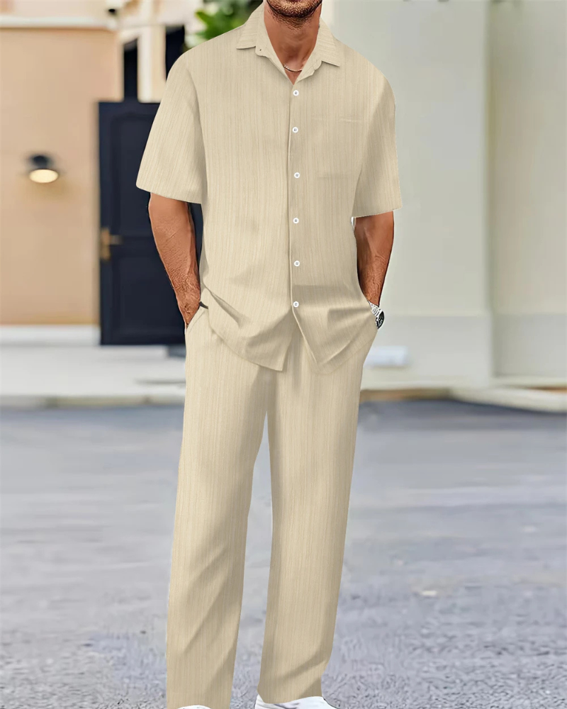 Dieser stylische Zweiteiler für Herren besteht aus einem klassischen Kurzarm-Hemd mit Knopfleiste und einer locker geschnittenen Hose – ideal für entspannte Tage, Reisen oder sommerliche Freizeitlooks. Komfort und Stil vereint in einem Set.
