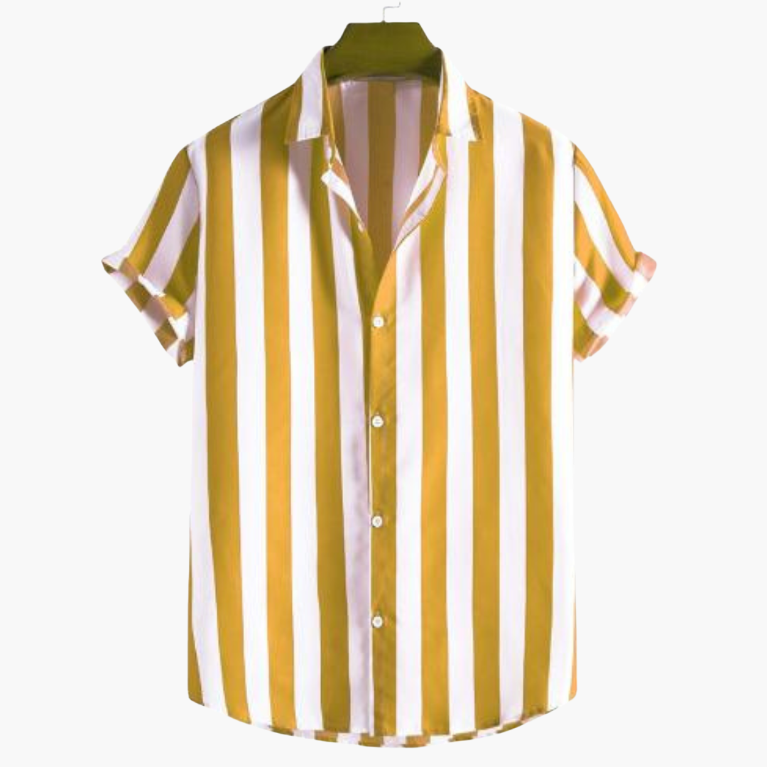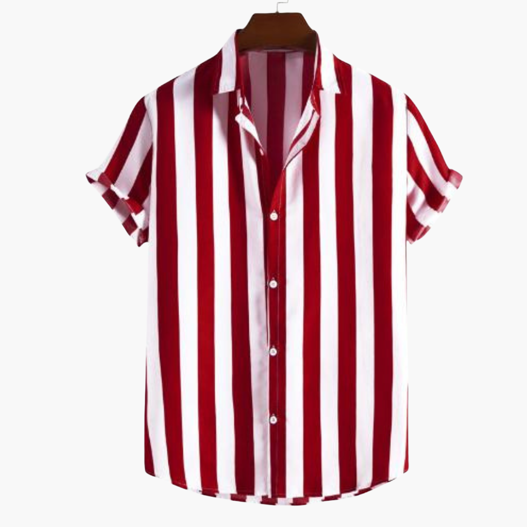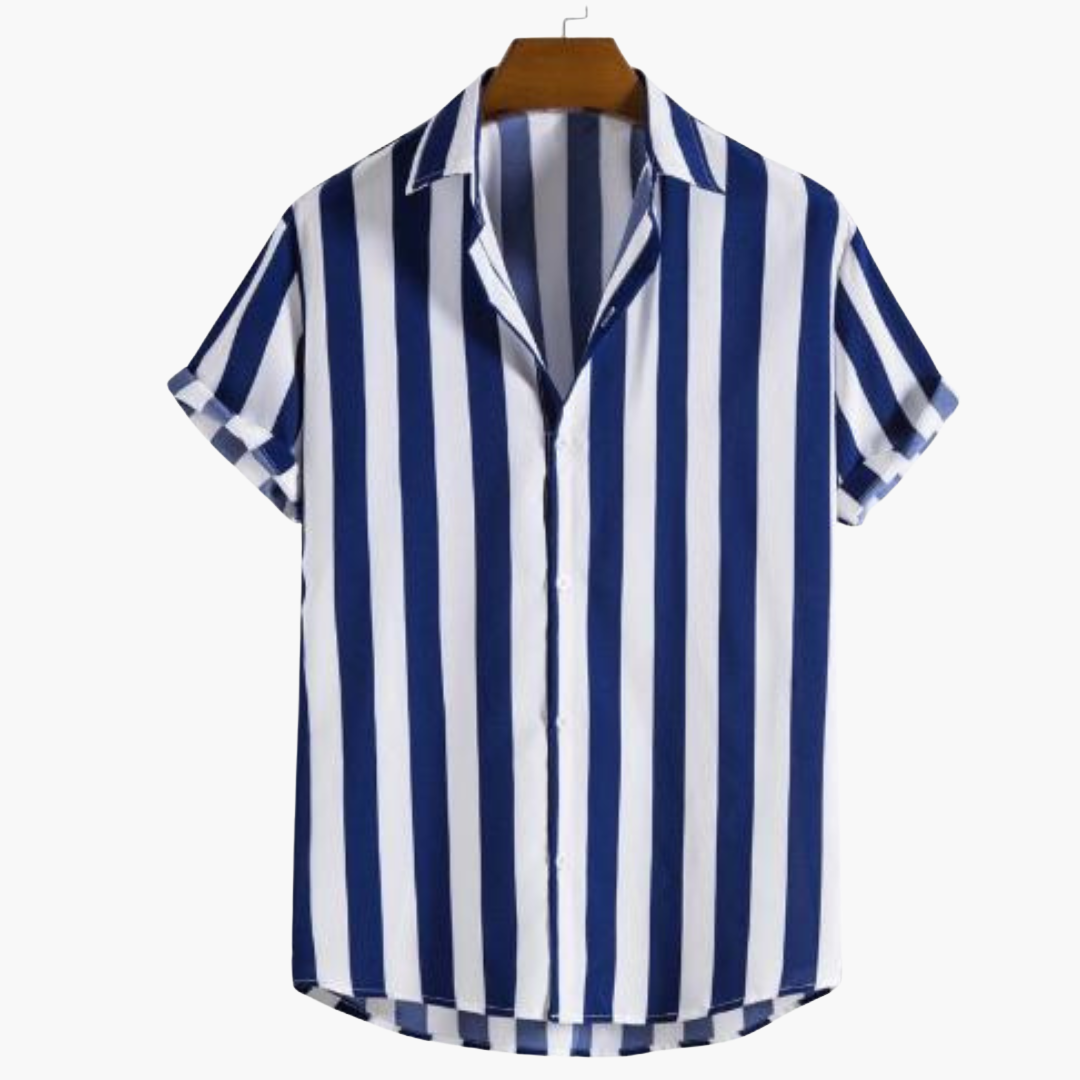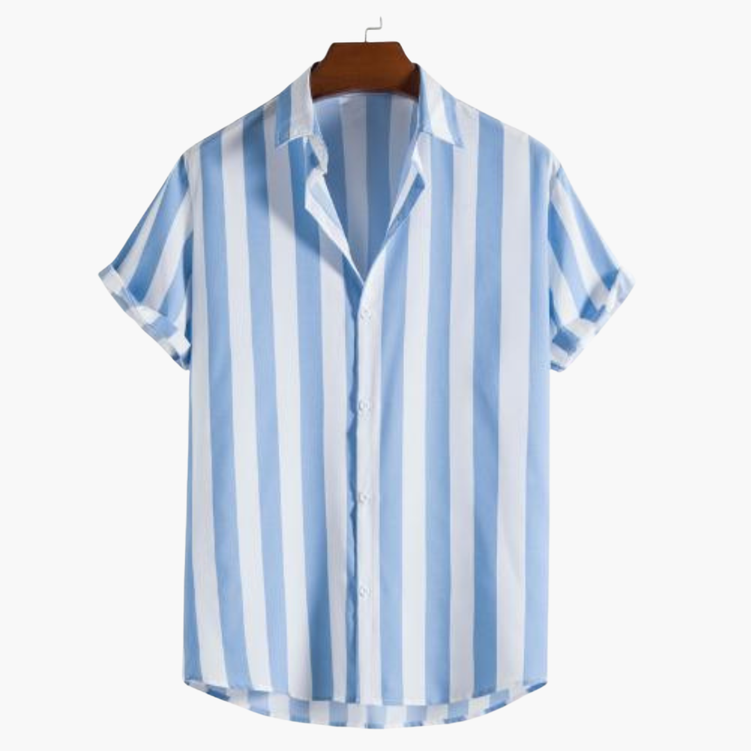 Herrenhemd aus leichtem Stoff für den Sommer. Mit kurzen Ärmeln, Knopfleiste, offenem Kragen und lockerem Schnitt. Vertikales Streifenmuster und hochgekrempelte Ärmel. Geeignet für legere oder smart-casual Anlässe bei warmem Wetter.