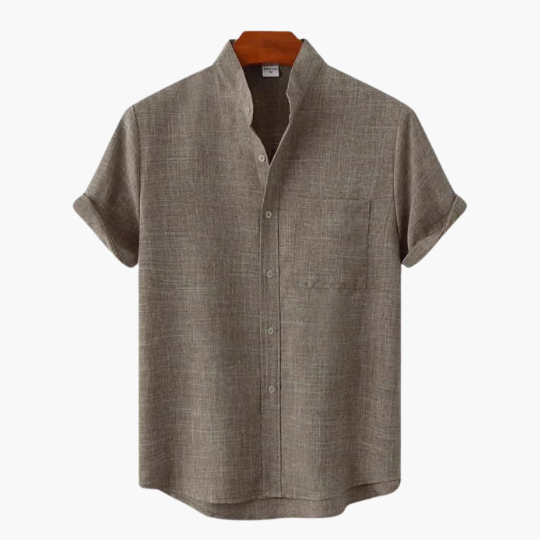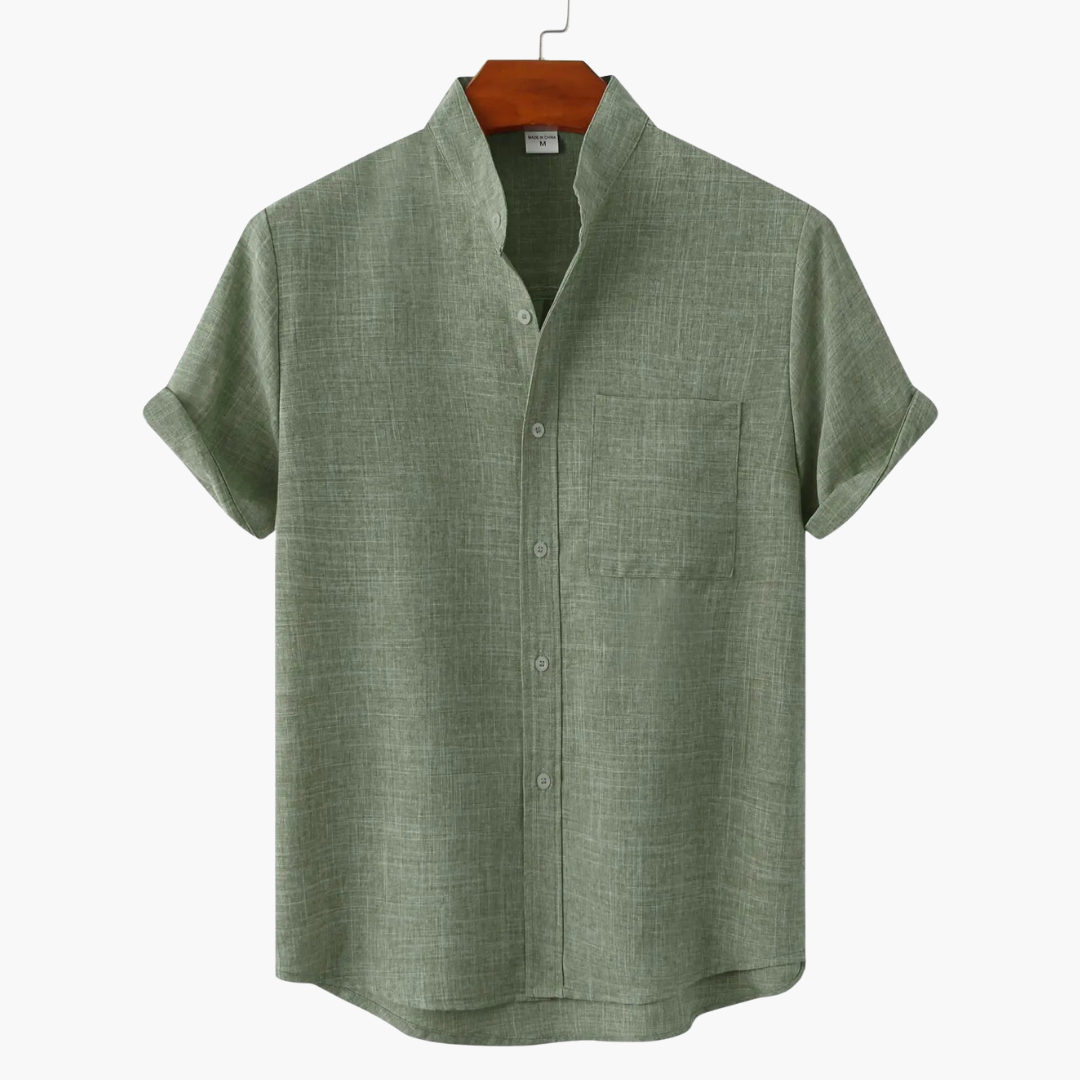 Dieses Herren-Kurzarmhemd besteht aus leichtem, atmungsaktivem Gewebe und ist für den Sommer geeignet. Es verfügt über kurze Ärmel, einen Stehkragen, eine Knopfleiste vorne und eine Brusttasche. Das Hemd hat eine lockere Passform mit strukturierter Webung und eignet sich für legere und halbförmliche Anlässe.
