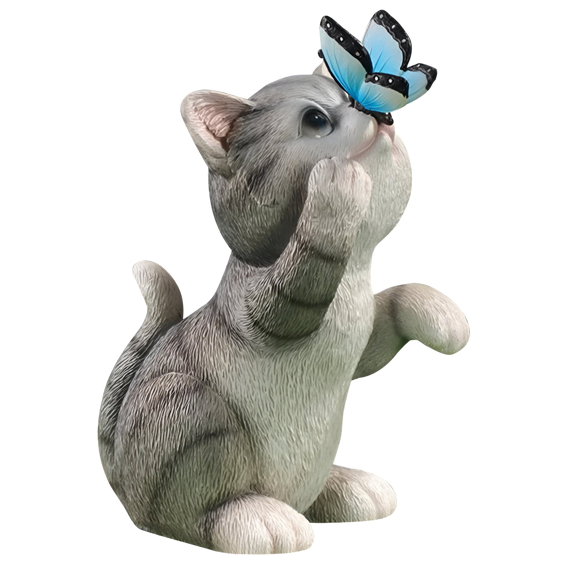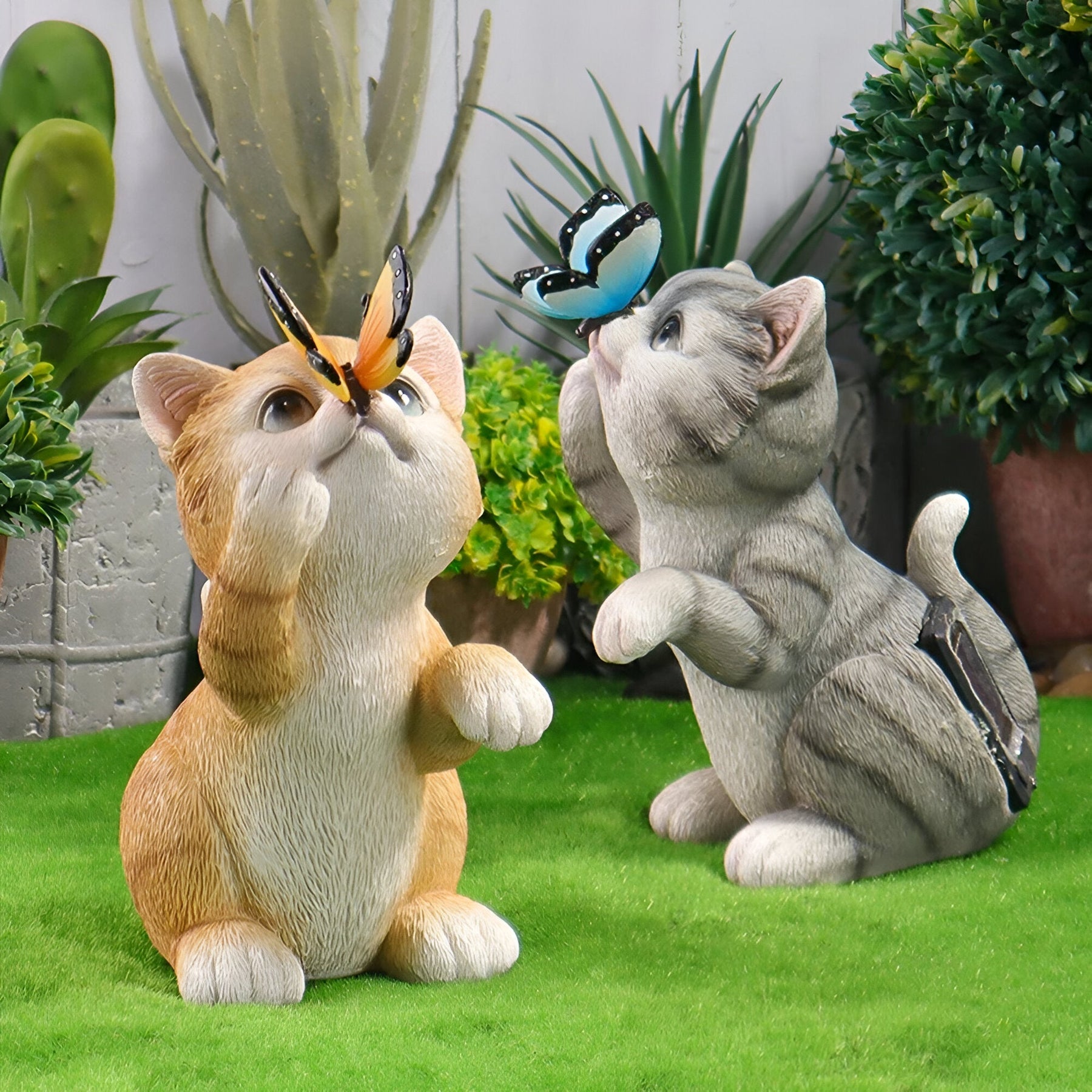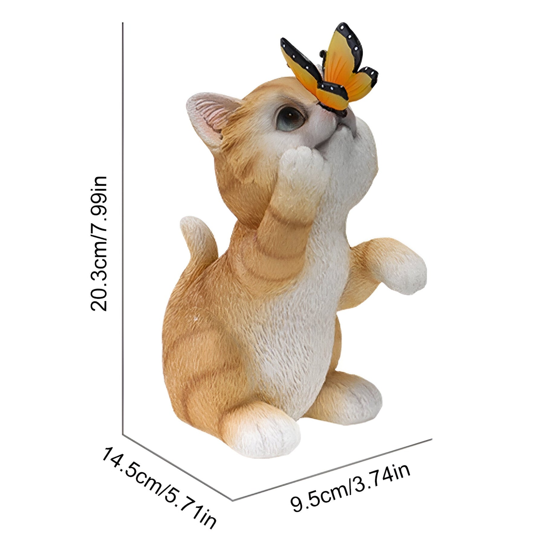 Die detailreiche Katzenfigur mit einem leuchtenden Schmetterling auf der Nase verleiht Ihrem Garten eine besondere Note und zieht alle Blicke auf sich. -
