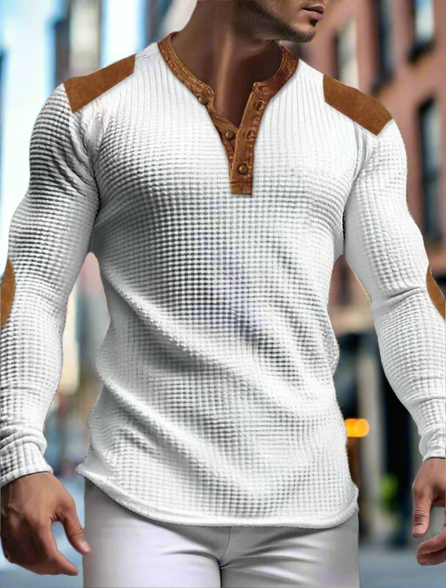 Das Patrick- Men's waffle-knit henley shirt with patchwork patches bietet die perfekte Mischung aus Stil und Komfort für den modernen Mann. Das Waffelstrickmuster sorgt für eine angenehme Struktur und Atmungsaktivität, während die Patchwork-Akzente ein einzigartiges, modisches Detail darstellen. Der Henley-Ausschnitt verleiht dem Shirt eine sportliche Note, die sich ideal für den Alltag oder entspannte Freizeitaktivitäten eignet. Mit seinem lässigen und doch ansprechenden Design ist dieses Shirt ein vielseitiges Must-Have für die Herbst- und Wintersaison.