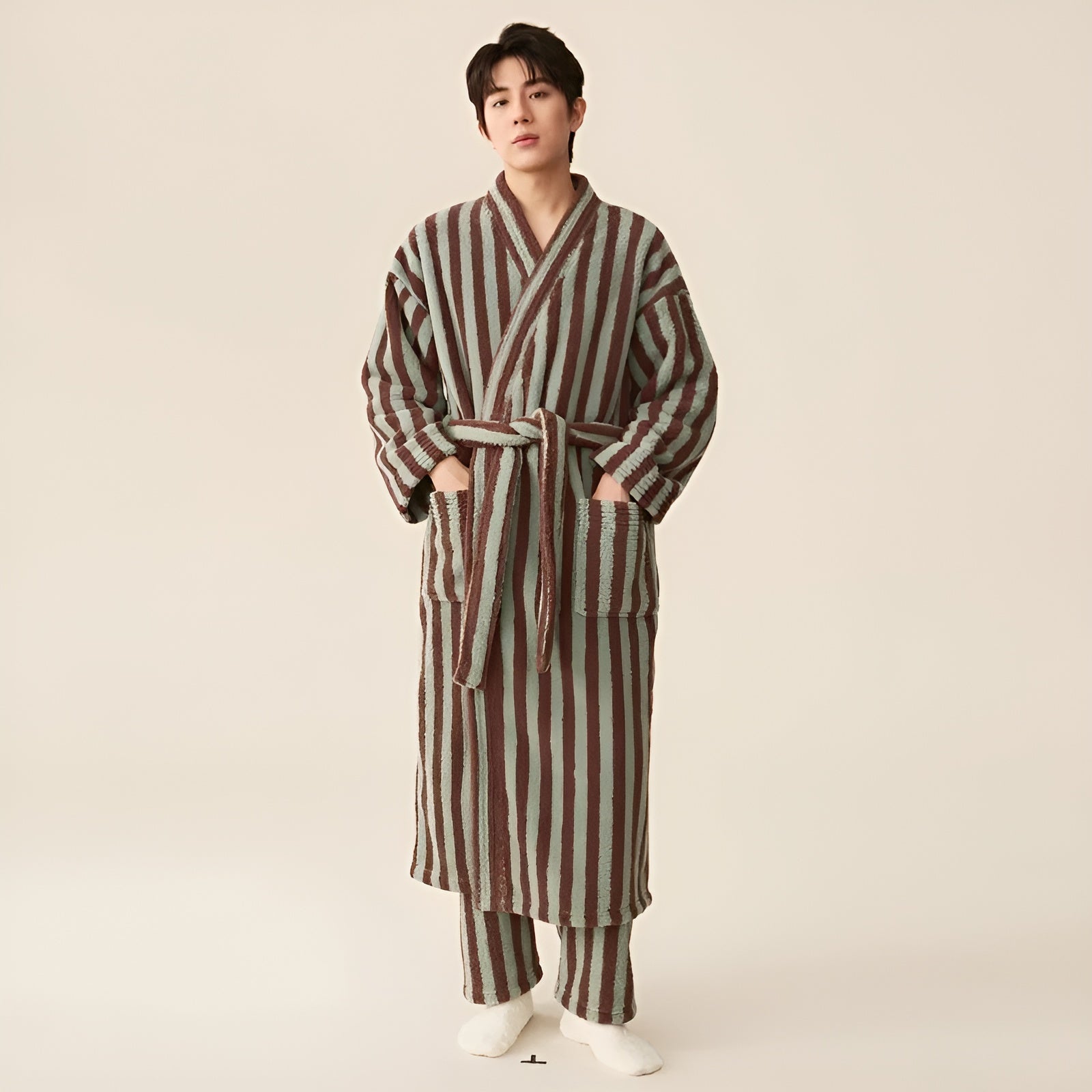 Erleben Sie die perfekte Kombination aus Wärme und Stil mit dem PlushWrap Robe, Ihrem idealen Begleiter für gemütliche Winterabende. Dieses weiche, gestreifte Bademantel-Pyjama-Set ist für Paare gemacht, die Wert auf Komfort und modernes Design legen. Egal, ob Sie gemeinsam einen Film schauen oder den Morgen entspannt beginnen möchten – das PlushWrap Robe-Set bringt Wärme und Harmonie in Ihren Alltag.