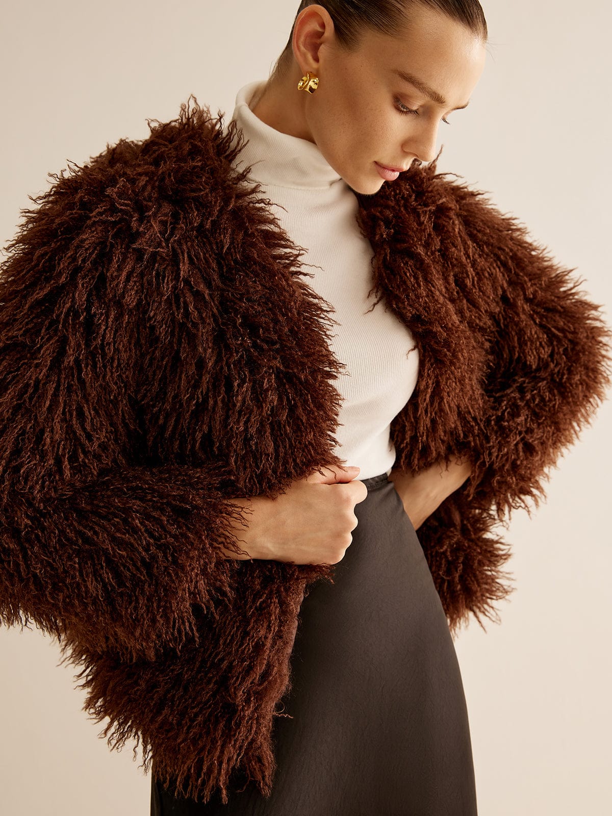 Diese kuschelige Kunstfelljacke in einem warmen Schokoladenbraun ist ein echtes Statement für stilbewusste Fashionistas. Ihr flauschiges, voluminöses Design verleiht jedem Look eine elegante, aber dennoch lässige Note.