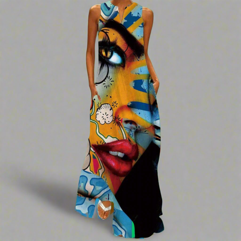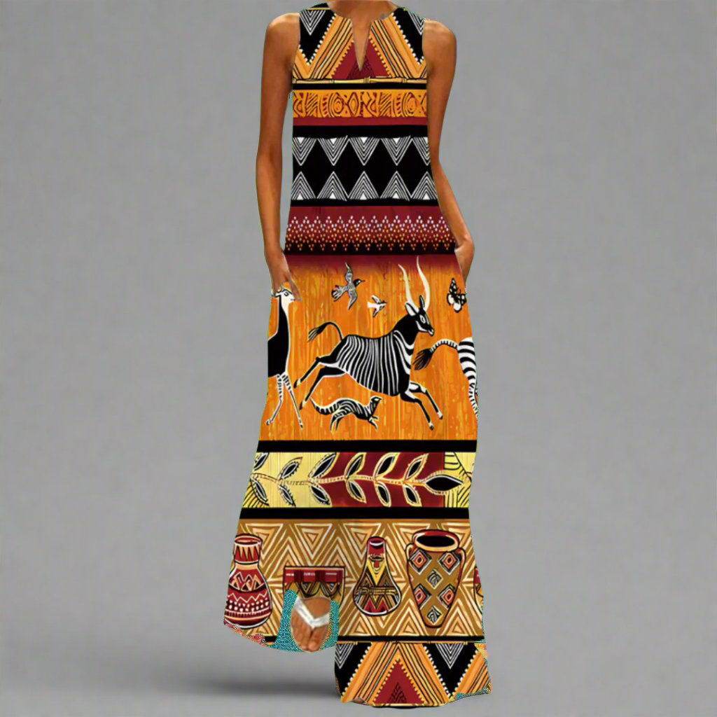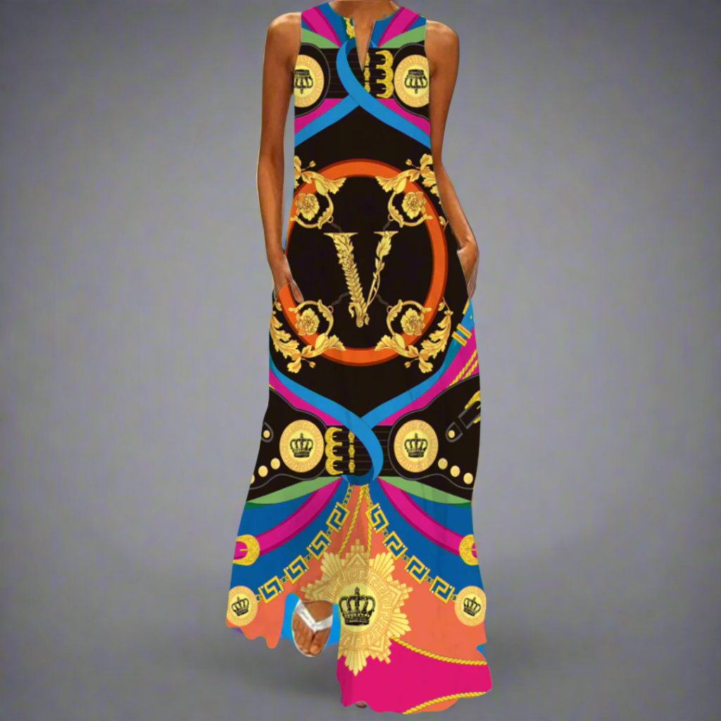 Erlebe den perfekten Sommerlook mit dem Briselotte Vintage Print Maxi-Kleid. Dieses elegante, ärmellose Kleid mit V-Ausschnitt und Taschen ist perfekt für sommerliche Anlässe, von Urlaubsreisen bis hin zu entspannten Nachmittagen am Strand. Der luftige Stoff und das lockere Design bieten dir sowohl Stil als auch Komfort, während der V-Ausschnitt und die stilvollen Prints deinen Look abrunden.