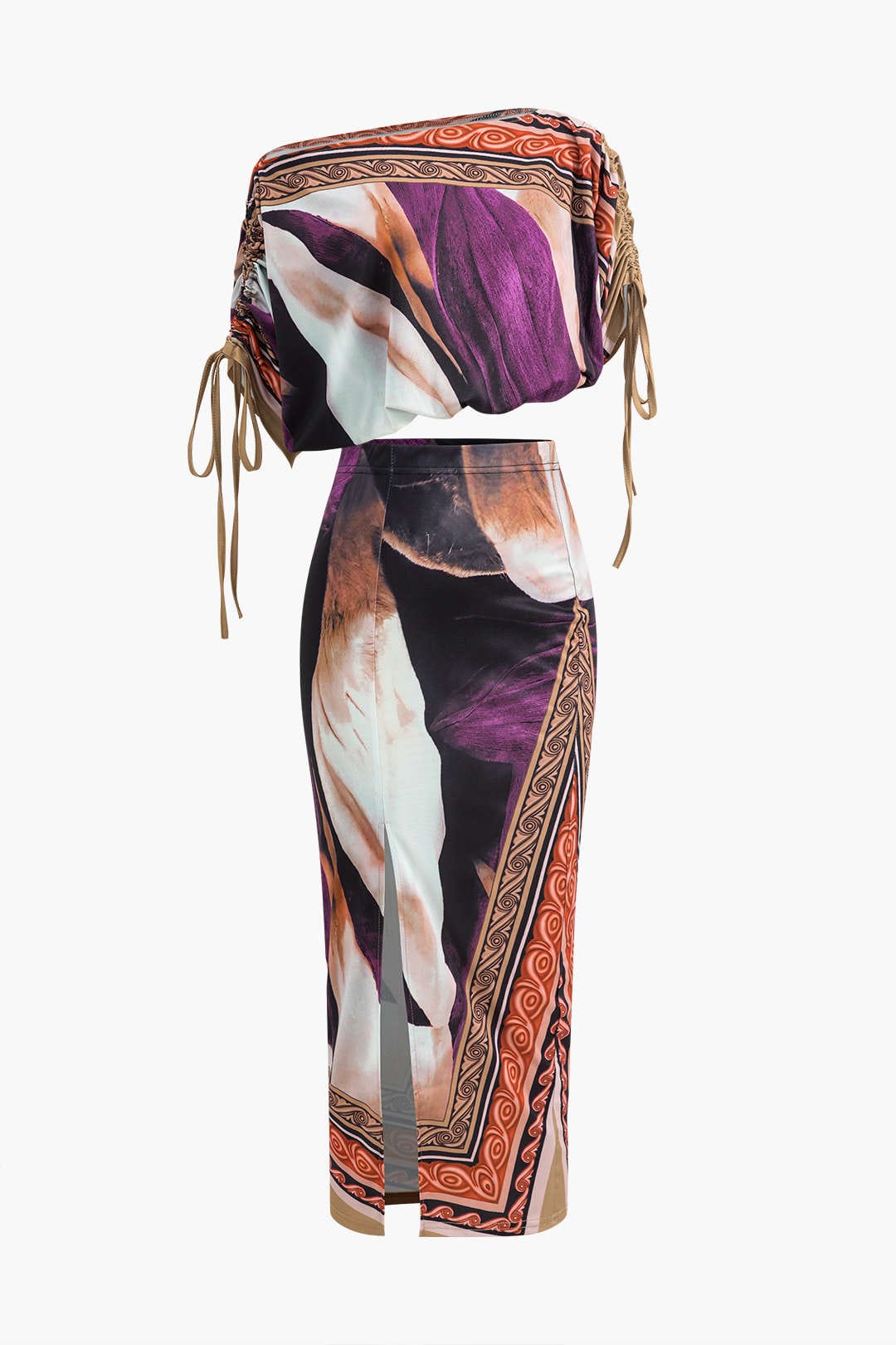 Das Clarissa Zweiteiler-Set vereint auffälliges Design mit luxuriöser Eleganz. Die asymmetrische Off-Shoulder-Bluse mit kunstvollen Raffungen und Kordeldetails an den Ärmeln verleiht dem Look eine edle und feminine Ausstrahlung. Der figurbetonte Bleistiftrock mit modernem Schlitz betont die Silhouette und sorgt für eine schmeichelhafte Passform.