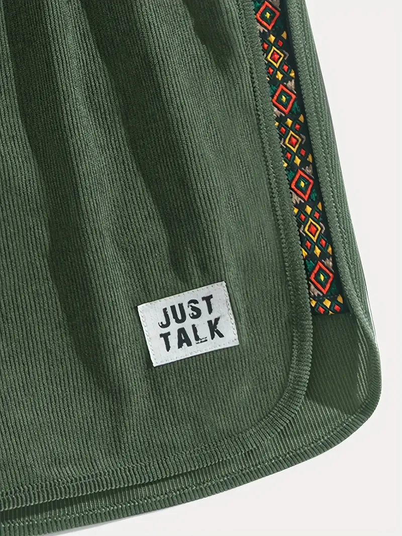 Stylisches Entwurf: Das seitliche Muster im Tribal-Schau verleiht dem minimalistischen Entwurf einen auffälligen Akzent und sorgt für einen lässigen Schau. In Kombination mit dem „JUST TALK”-Patch spricht diese Šortky alle an, die Individualität und Streetstyle-Mode schätzen. Ein Highlight in jedem Kleiderschrank.