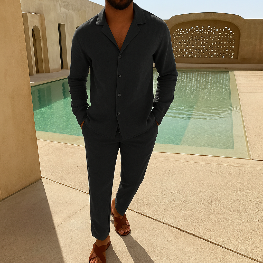 Conjunto de dos piezas ideal para primavera y verano. Camisa de manga larga con cuello clásico y pantalones ligeros de algodón. Corte moderno, tejido cómodo y disponible en varias tallas (S a XXXL).