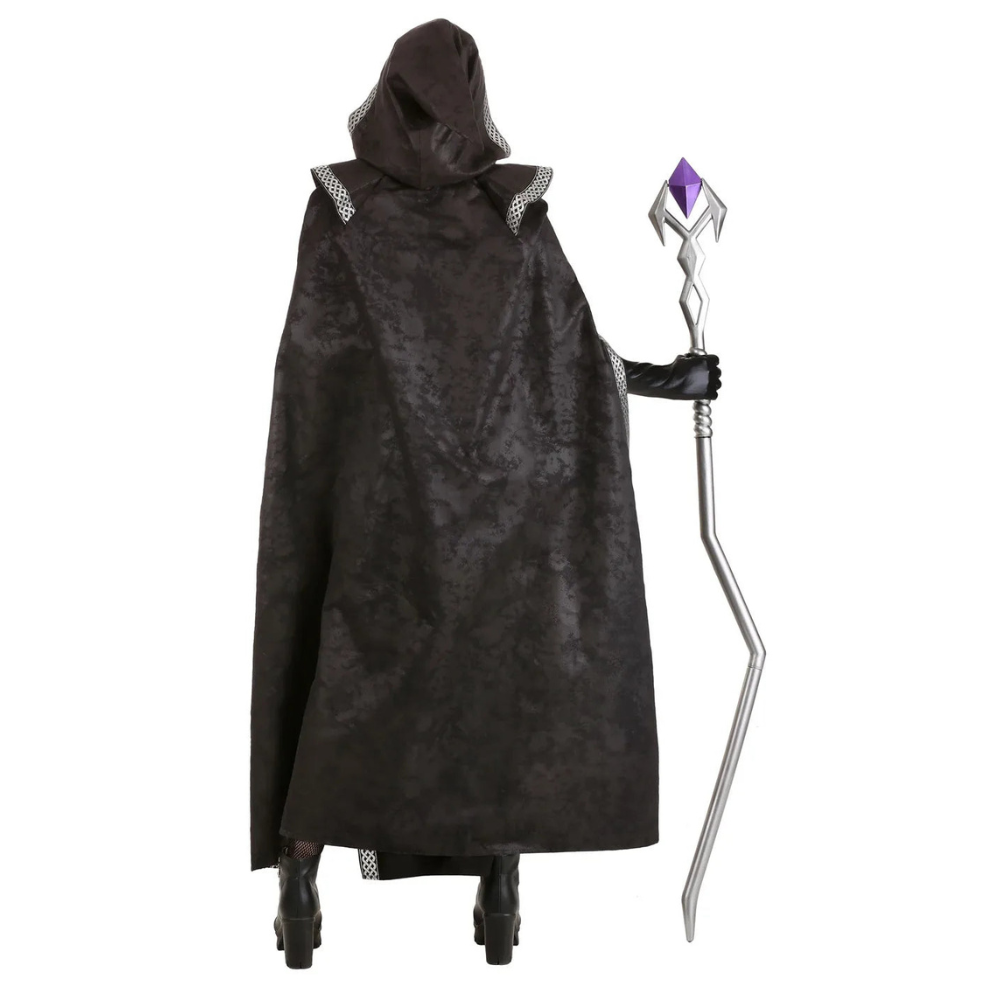 Dieses Halloween-Kostüm enthält einen Kapuzenumhang, einen taillierten schwarzen Body und ein silberfarbenes Halstuch. Das Outfit ist so gestaltet, dass es einen eindrucksvollen Look bei Fantasy-Events und Verkleidungsveranstaltungen unterstützt.