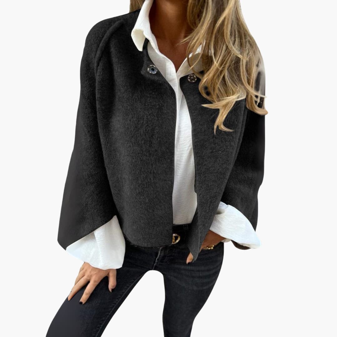 Diese Damenjacke hat einen Rundhalsausschnitt mit einem Verschluss aus zwei Knöpfen. Das kurze Design umfasst lange Ärmel und eine schlichte strukturierte Oberfläche. Der gerade Saum und der lockere Schnitt machen sie vielseitig kombinierbar für Übergangszeiten.