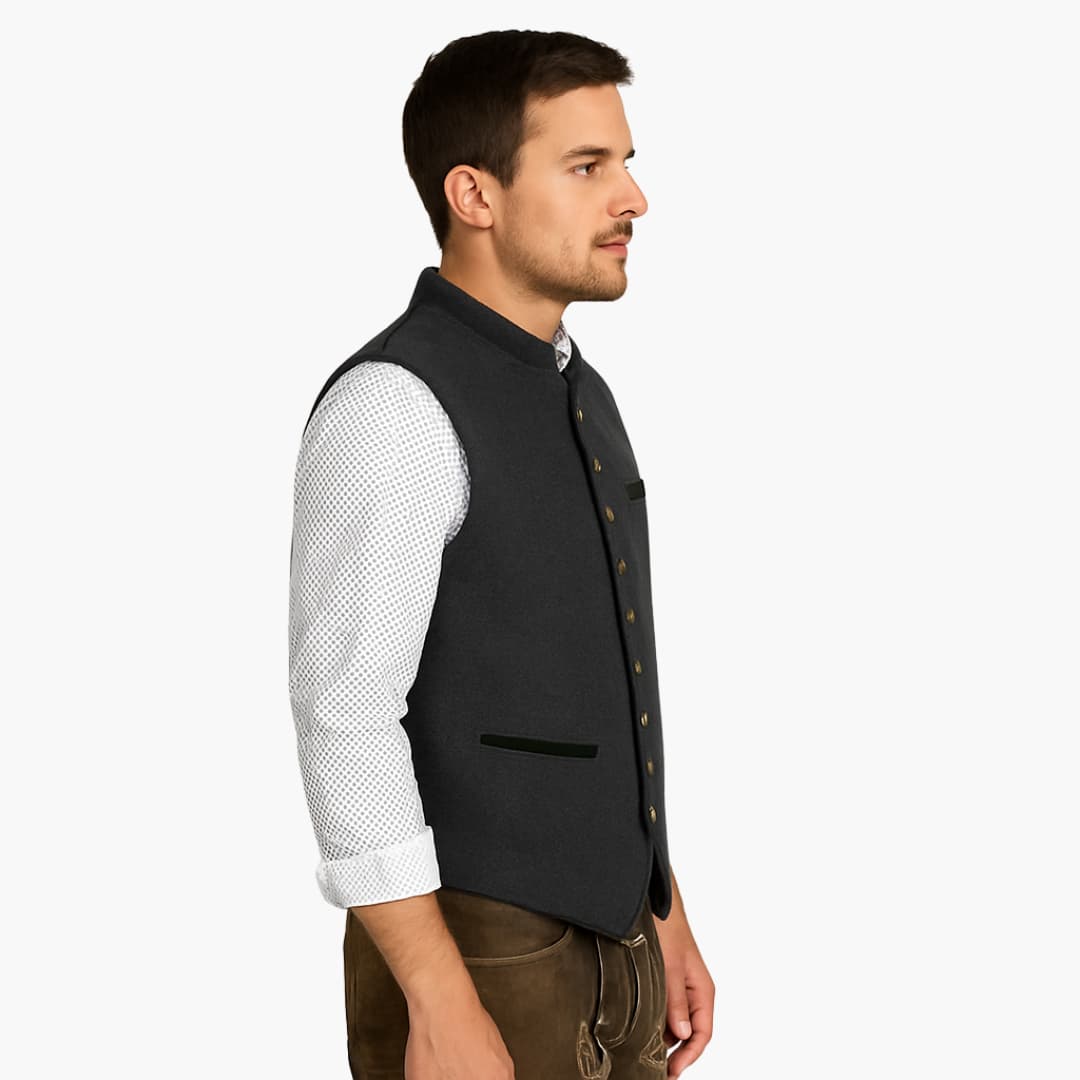 Diese klassische Trachtenweste vereint traditionelle Elemente mit einer modernen Form und ist speziell für Herren entworfen, die bei festlichen Anlässen oder Volksfesten einen strukturierten und gepflegten Look bevorzugen. Durch ihren klaren Schnitt und die dekorativen Akzente lässt sie sich sowohl zu traditioneller Tracht als auch zu zeitgemäßer Kleidung kombinieren.