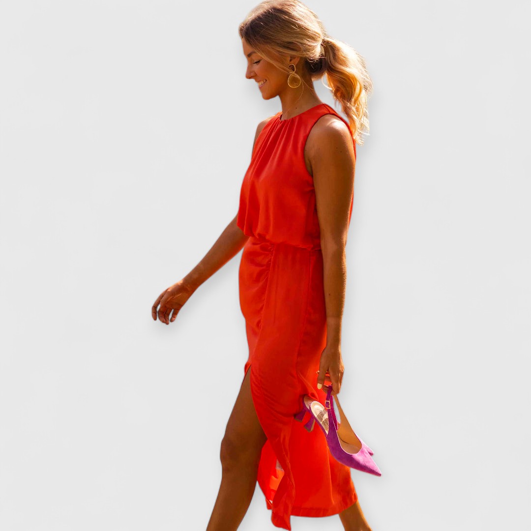 Wir präsentieren unser meistverkauftes Liene Midi Kleid, die perfekte Kombination aus Komfort und Eleganz für die warmen Tage, an denen Sie mühelos schick aussehen möchten. Dieses atemberaubende Stück schmeichelt jeder Figur, ohne einzuengen, und bietet einen eleganten hohen Ausschnitt sowie ein ärmelloses Design, das moderne Anmut ausstrahlt.
