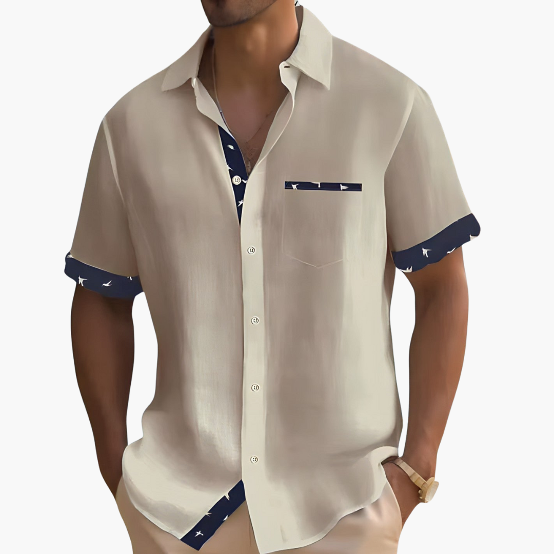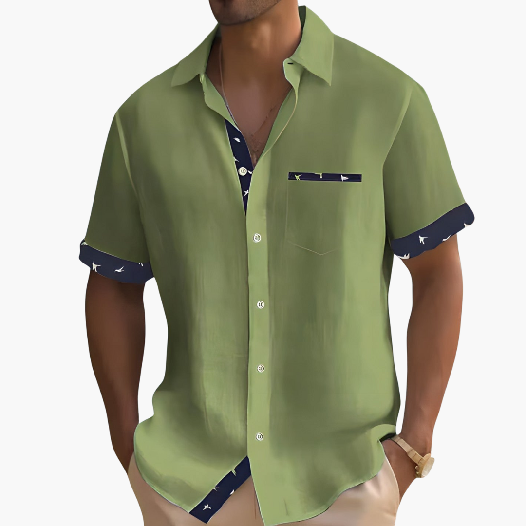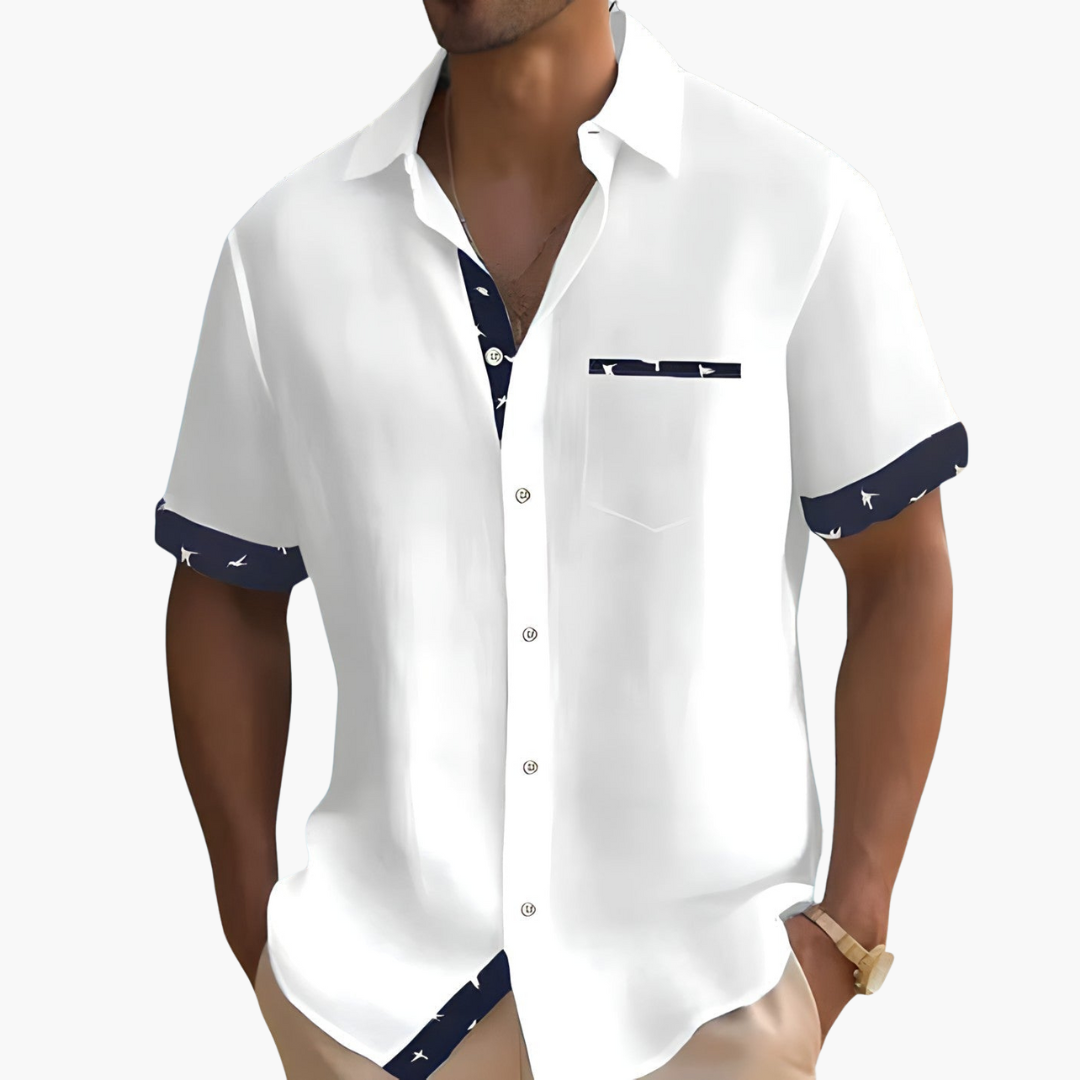 Dieses kurzärmelige Herrenhemd besteht aus einem leichten Stoff, der sich ideal für den Sommer eignet. Es verfügt über einen klassischen Kragen, eine Knopfleiste auf der Vorderseite und kontrastierende Details an den Manschetten, der Knopfleiste und der Brusttasche. Der gerade Saum und das atmungsaktive Material machen es passend für legere und halbformelle Anlässe.