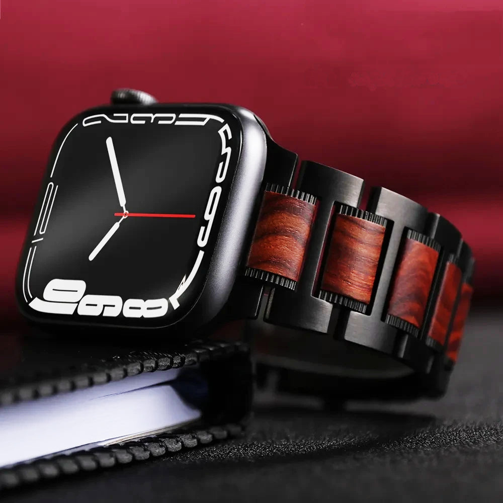 Dieses anspruchsvolle Armband wertet Ihre Apple Watch auf, indem es die Haltbarkeit von Edelstahl mit der natürlichen Anziehungskraft von rotem Sandelholz kombiniert und ein einzigartiges und markantes Accessoire bietet, das natürliche und industrielle Materialien nahtlos integriert.