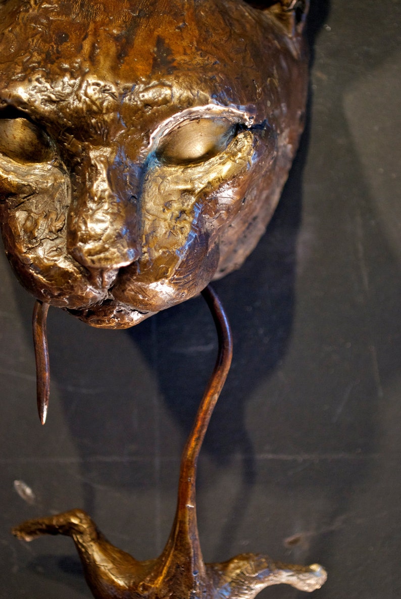 Wunderschönes, originales Katzenporträt aus Bronze von Augie mit einer schwingenden Maus im Maul, gestaltet zur Verwendung als Türklopfer oder Wandskulptur.