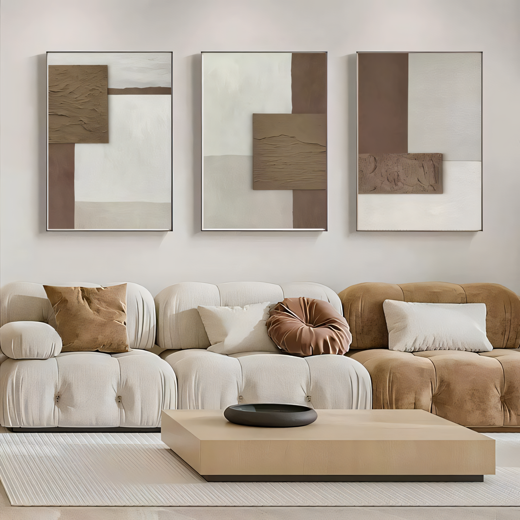 Beruhigende Atmosphäre: Verbessern Sie Ihren Wohnraum mit der beruhigenden Präsenz dieser abstrakten geometrischen Kunstwerke, die auf Leinwand gedruckt sind. Ihre ruhige Bildsprache fördert Entspannung und Gelassenheit und verwandelt Ihre Umgebung subtil in ein Refugium des Friedens.