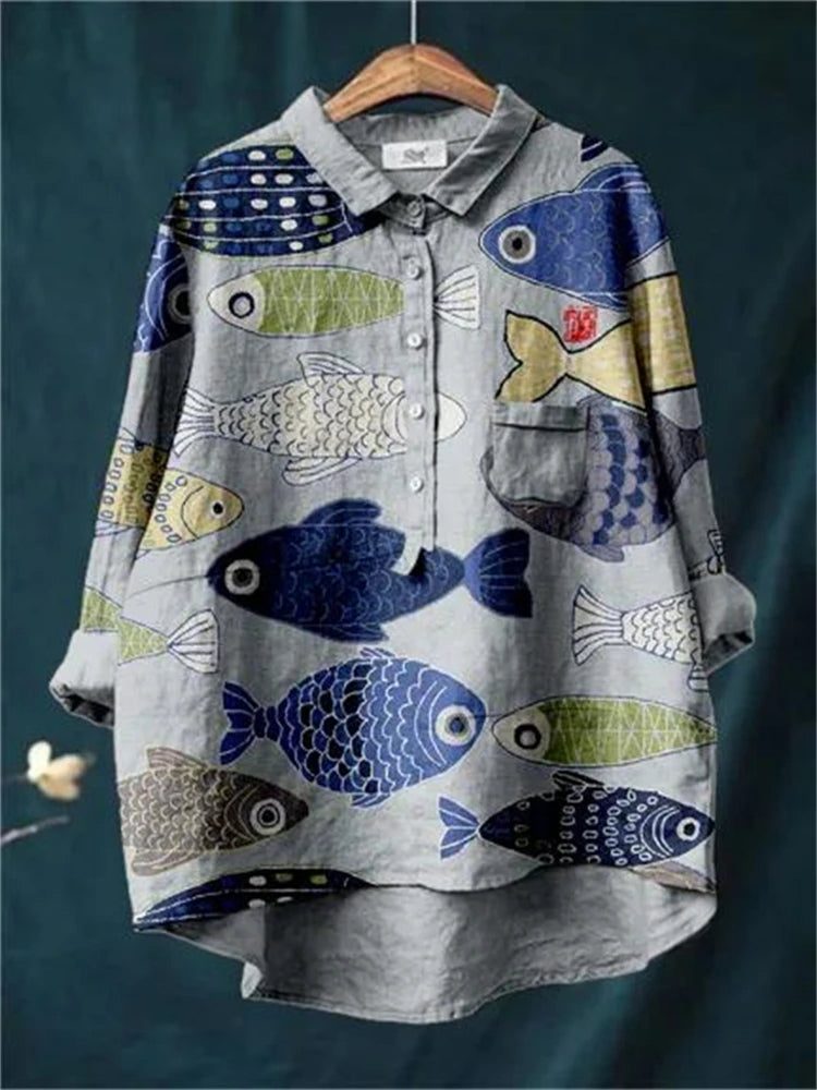 Sophia - Vintage Fisch Sardinen Kunstdruck Baumwolle Leinen Hemd