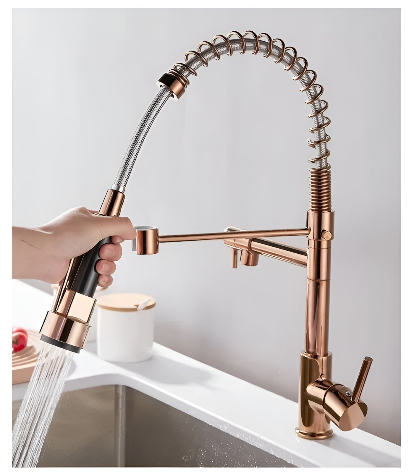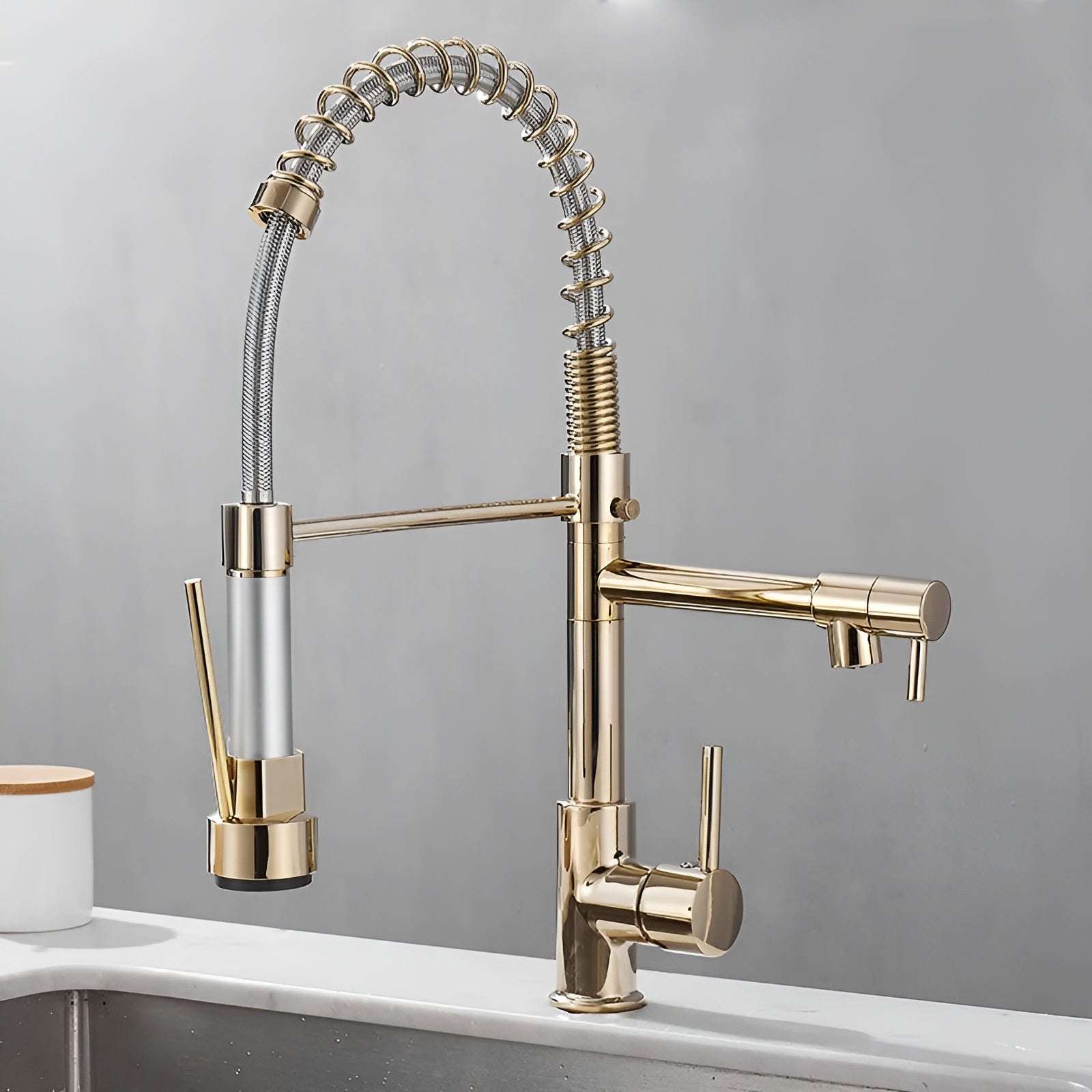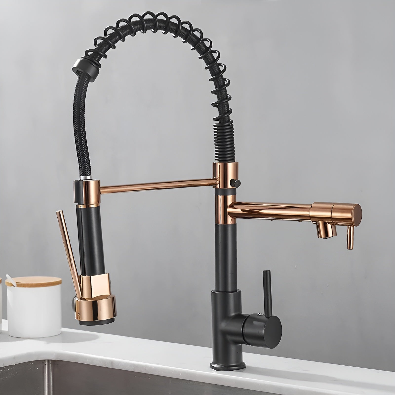 Suchen Sie nach einer Möglichkeit, Stil und Effizienz in Ihrer Küche zu vereinen? Der TwinStream Wasserhahn bietet beides! Diese Küchenarmatur mit Doppelauslauf ist aus hochwertigem Messing gefertigt und besticht durch das schwarze und goldene Finish. Das flexible Federdesign ermöglicht eine einfache Anpassung des Wasserflusses, ideal für alltägliche Aufgaben wie Abwaschen und Vorbereiten von Mahlzeiten.