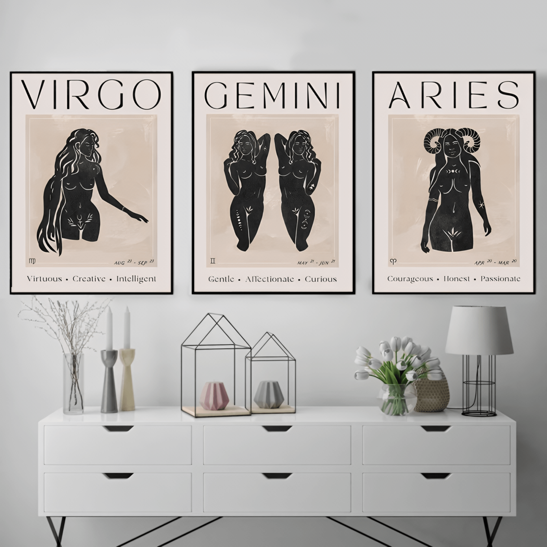 Deine Wände kennen dich besser, als du denkst. Sie haben deine Mitternachts-Epiphanien, deine stillen Siege und das wahre Ich gesehen, das über Instagram-Filter hinaus existiert. Diese Tierkreis-Drucke sind nicht nur Dekoration – sie sind Bestätigungen dessen, wer du bist, in den Sternen geschrieben.